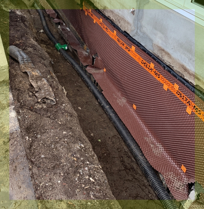 Après nettoyage de la fondation, nous appliquons une membrane imperméabilisante élastomère, souvent combinée à un panneau de drainage rigide ou alvéolé (de type Delta-MS). Cette solution permet de :